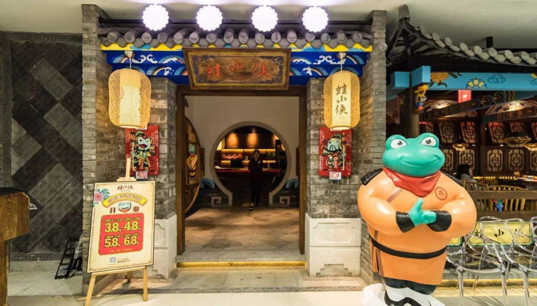 蛙小俠:以武俠IP形象切入餐飲,從品牌命名到圖形設(shè)計(jì),再到空間裝飾,完全照搬功夫熊貓的武俠卡通形式,塑造了鮮明的武俠形象,品牌的識(shí)別度極高。品深餐飲設(shè)計(jì)認(rèn)為:模仿始終是模仿,并非自己獨(dú)有的品牌形象體系,始終給消費(fèi)者一種抄襲,模仿的感覺,不利于品牌未來的沉淀發(fā)展。