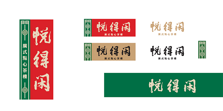因此,悅得閑的logo我們使用圖形加文字的形式。大紅色的底色上用金色的品牌字,傳遞一種茶樓出品的品質感,表示金字招牌之意。左側綠色色塊上一個原創圖形,取自于得閑飲茶的閑字,將閑字變形,用點心蒸籠的圖形填充,表明了品類屬性也傳達了得閑飲茶的文化IP。