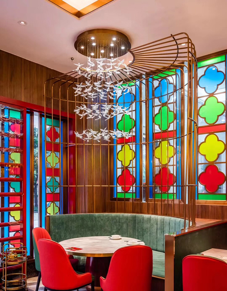 餐廳的空間裝飾設計是由門頭形象、地面、墻面、天花頂飾、家具設備、燈飾照明、綠色植物、軟裝飾等多種因素和諧融合而成,顧客在空間中的活動,是一種連續而有趣的運動。在我們進行設計的時候要考慮到空間與人的呼應,既要相互獨立和相互聯系的各種功能空間,又要有便捷和流暢的動線路徑,同時在空間中使用具有典型西關茶樓文化特征的裝飾品如鳥籠式吊燈、定制的茶幾、量身定制的茶具進行點綴,豐富了空間的感受,烘托了茶樓的氣氛。而通過對聯、匾額、字畫的懸掛,則創造了一種含蓄優雅的境界。