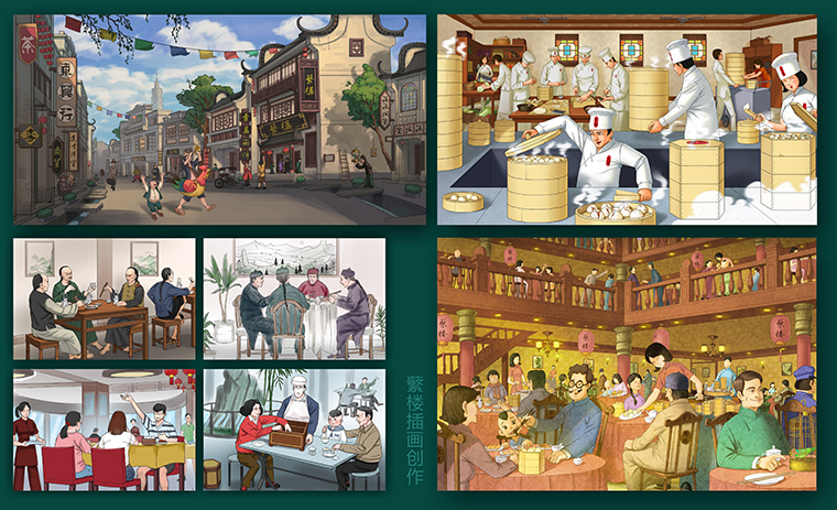4、根據(jù)蘩樓的歷史淵源,還原當(dāng)年的茶樓畫面: