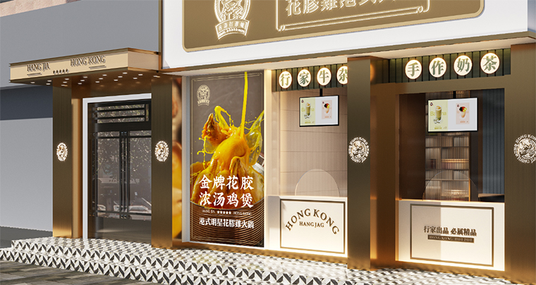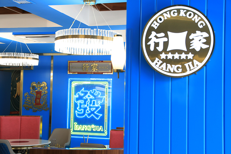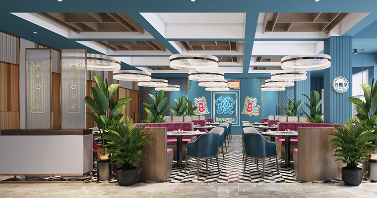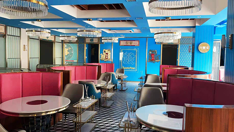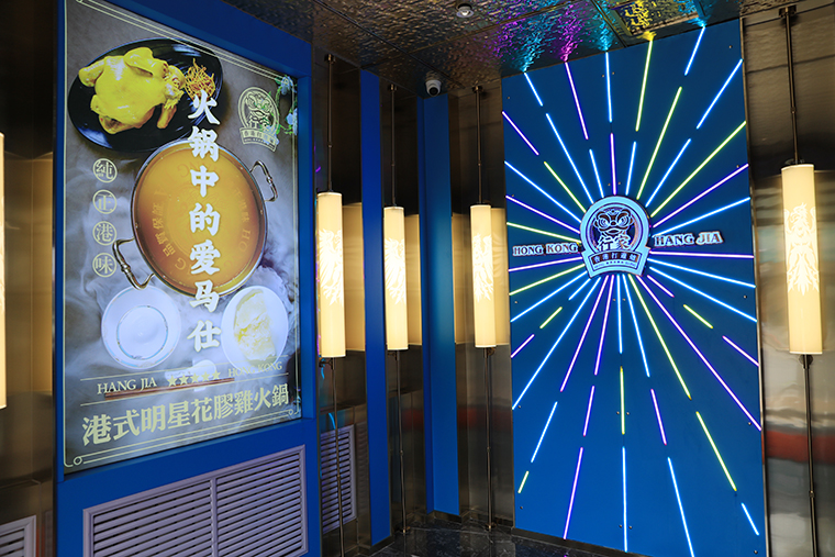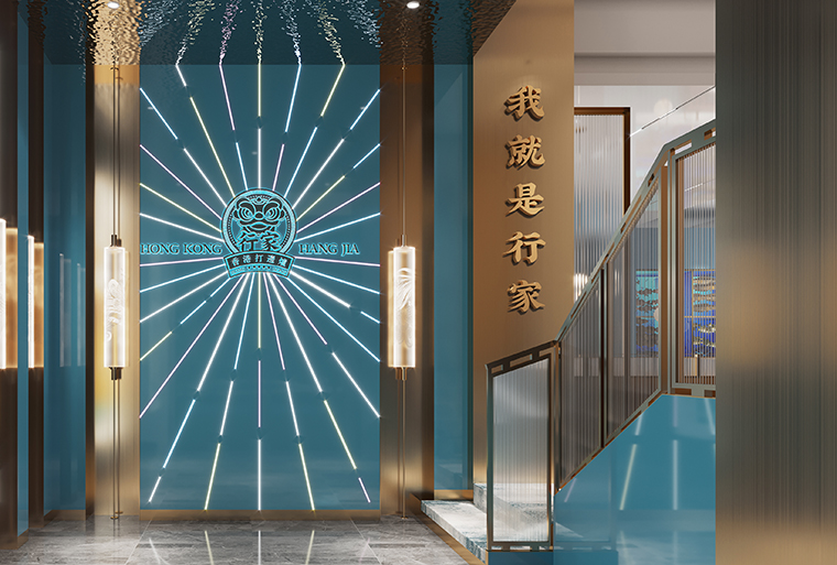 行家花膠雞港式打邊爐餐廳在顏色設計上結合品牌色,大面積使用不銹鋼金色,藍綠色,暗紅色,將餐廳打造成主題風格截然不同的港式餐廳,同時融入具有地域風情的港式風味,在文化元素上植入恭喜發財,順、發、喜等傳統香港吉祥話語元素,傳統與現代的元素融合在餐飲空間中,突破了人們對傳統港式餐廳的認知,重新定義新派港式打邊爐餐廳的基調。