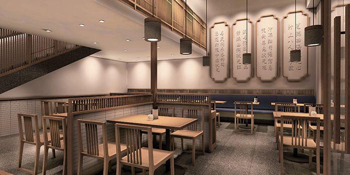 古代的懷舊是用餐空間設計中經常使用的主題。它收集并組織了豐富的歷史和文化特色,再現了歷史魅力,并賦予了食物空間以強大的生命力和吸引力。爬上樓梯后,覆蓋著藍灰色石板的地面是蜿蜒的走廊。環境營造出一種平靜和清晰的感覺。