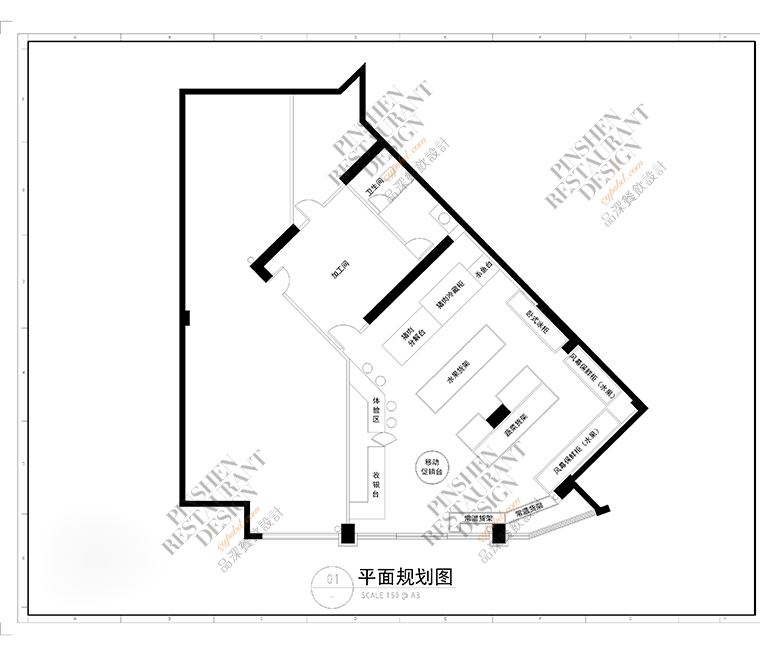 為了實(shí)現(xiàn)以上兩個(gè)目標(biāo),我們將功能進(jìn)行合理的分區(qū),使空間實(shí)現(xiàn)了最大化利用;在裝飾設(shè)計(jì)方面則以主題深綠色,搭配使用淺灰色,形成一種簡(jiǎn)潔素雅,明快整齊的空間格調(diào),并與其他生鮮品牌形成了明顯的區(qū)分;墻面及門框、臺(tái)面等,我們使用紋理較為細(xì)膩的木色,與空間淺灰色配合,形成一種時(shí)尚,高級(jí)的氛圍感。