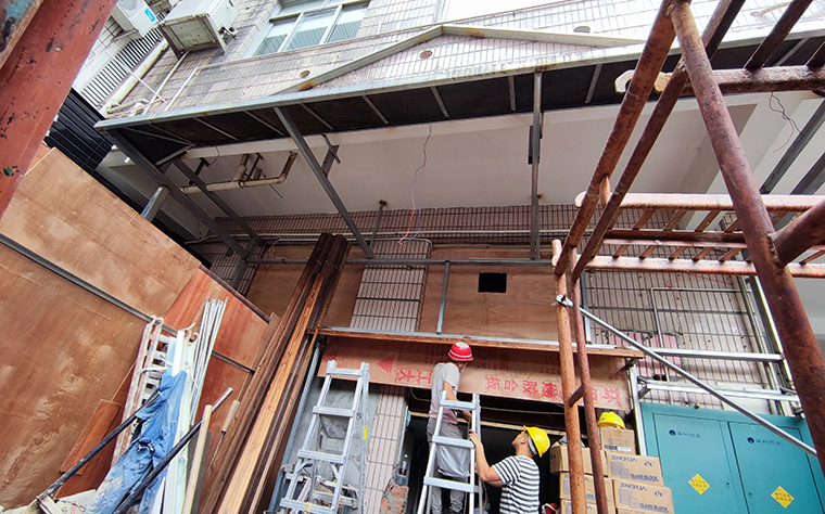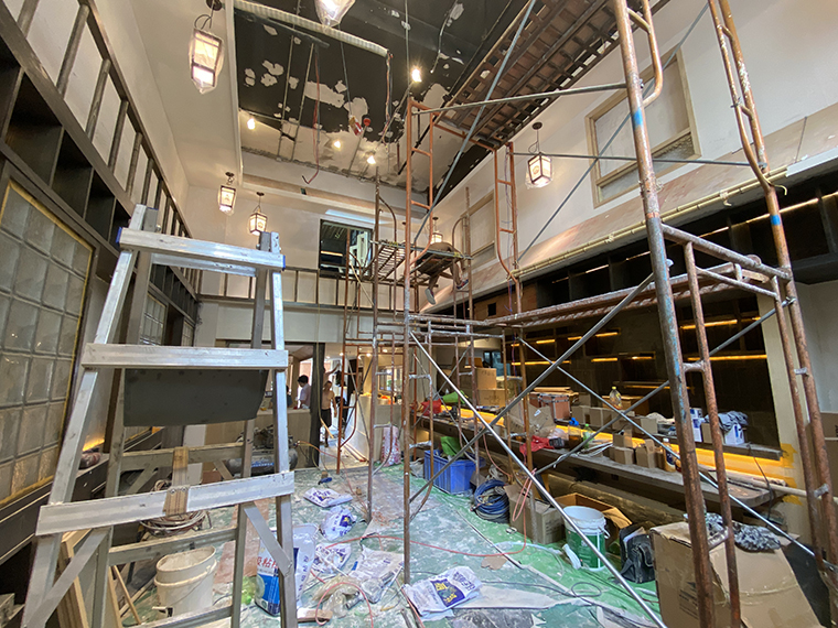 玉椿燒鳥居酒屋首店位于深圳的餐飲網(wǎng)紅高地——車公廟十畝地正對面。門店之前是一家中餐的后廚的全部空間及部分包間,其中一半的面積屬于上一家餐廳自己搭建的二層。空間結(jié)構(gòu)非常復(fù)雜,地面高地不平,尤其是搭建部分的1層,2層實際高度不到2.5米,心理感受很逼窄,這個場地極為考驗品深項目團(tuán)隊中空間設(shè)計師的功力水平。