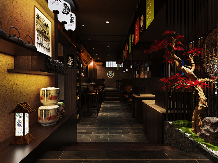 日本料理燒鳥居酒屋餐廳平面布局設(shè)計,日本料理空間裝飾效果圖設(shè)計,燒鳥居酒屋空間施工圖設(shè)計,居酒屋空間軟裝陳列設(shè)計,品牌文化植入空間策劃設(shè)計