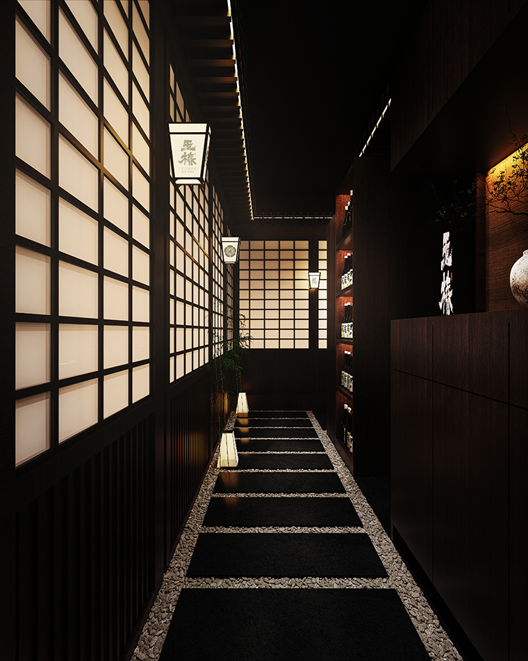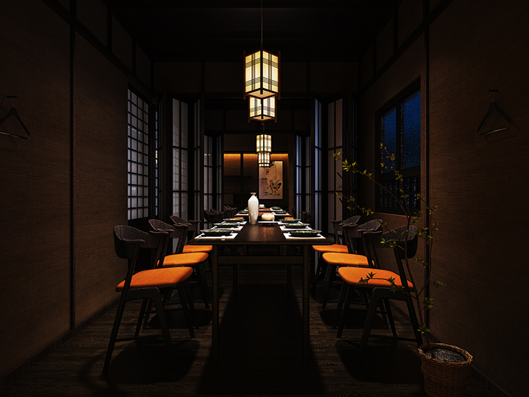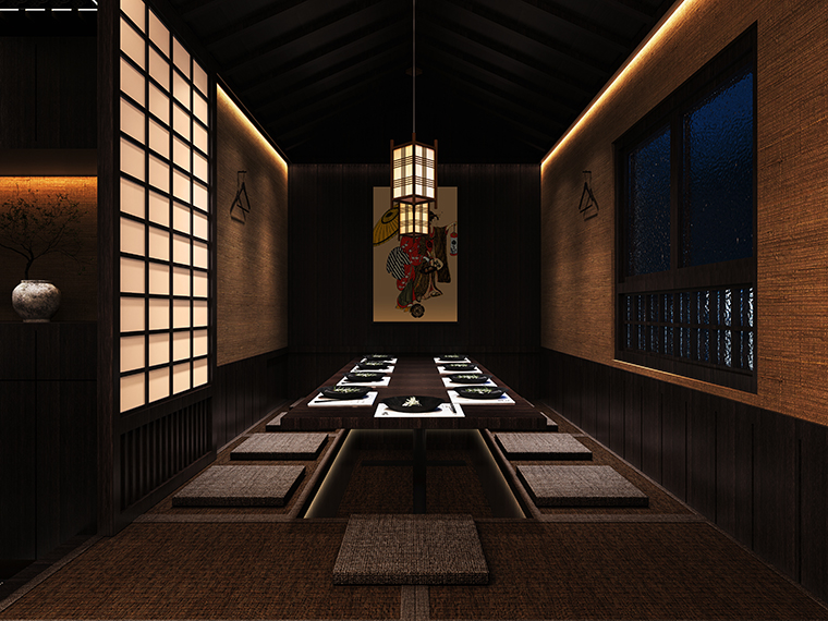 我們從門頭開始到天花吊頂、地面鋪設(shè)、墻面涂料、燈光、家具等各方面圍繞“京都味道、匠傳玉椿”來展開步移景異,一步一景的空間效果圖設(shè)計。