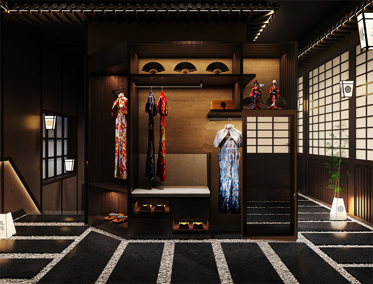 二樓除了必備的洗手間、儲物柜外,還設(shè)置了和服展示區(qū),這是餐飲娛樂化的一大重要趨勢。很多女性消費(fèi)者在日本料理店消費(fèi)時喜歡穿著和服自拍分享,彰顯個性也很有趣味,可以很好地把我們玉椿品牌傳播出去。品深餐飲設(shè)計就順應(yīng)這種潮流趨勢,擁抱變化,主動設(shè)置拍照打卡區(qū),讓消費(fèi)者傳頌。