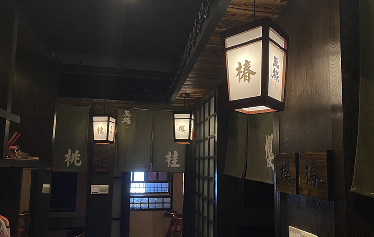 店內(nèi)的各種吊燈也是日式最經(jīng)典款式,在日本江戶時代是町家所用的,與品牌整個格調(diào)默默相融。吊燈上我們打上了日本六大名花:椿、櫻、桃、桂、梅、菊。既起到識別作用,又增強(qiáng)了品牌的文化底蘊(yùn)。