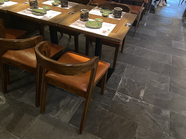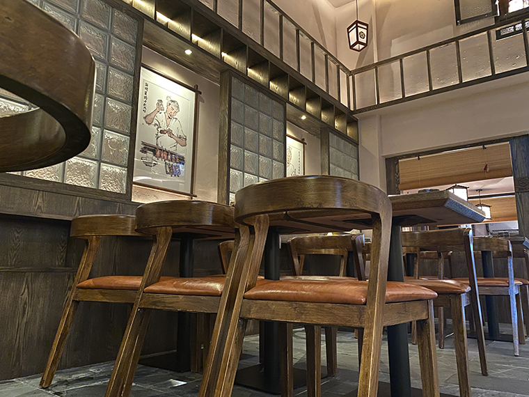 為了營造京都風(fēng)格的空間感受,品深餐飲為玉椿設(shè)計定制的家具采用了實木材質(zhì),開放漆做舊工藝處理,呈現(xiàn)出一種江戶時代的歷史滄桑質(zhì)感;與門店的招牌匾額,儲存柜顏色完全一致,顧客使用時候的歷史體驗感更為強(qiáng)烈。