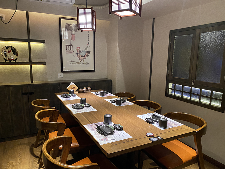 最能體現(xiàn)居酒屋熱鬧感的是大廳,最能感受燒鳥店煙火氣的是燒烤臺前的長吧臺。當(dāng)我們坐在燒鳥長吧臺前,看著燒鳥師傅熟練地穿串,精準(zhǔn)地控制火候,不時地翻動烤串,美味現(xiàn)場呈現(xiàn),匠傳玉椿的理念就鮮明直觀地傳達(dá)出來了。所以,整個大廳都是圍繞著燒烤吧臺這一焦點(diǎn)而展開的,全部為單人椅及兩人座位,位置靈活組合,利用率非常高。