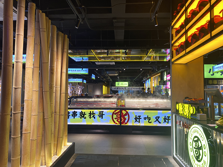串串香火鍋的用餐特點比較獨特,類似自助火鍋。顧客自己到冰柜取串串,拿飲品,喜歡什么就拿什么。因此,在門店功能設計方面,取串串的冰柜是客流最密集的地方,需要給顧客展示出串串品類特別多的優勢。
