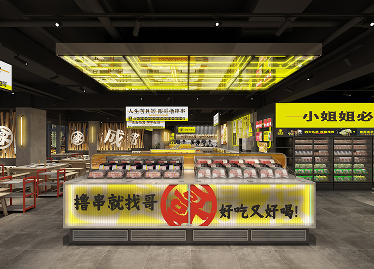 2、鹵串哥未來要走向全國,門店裝修成本控制在800元每平方之內,空間設計如何構建標準的門店裝修模型,讓品牌門店未來可以大規模復制擴張?