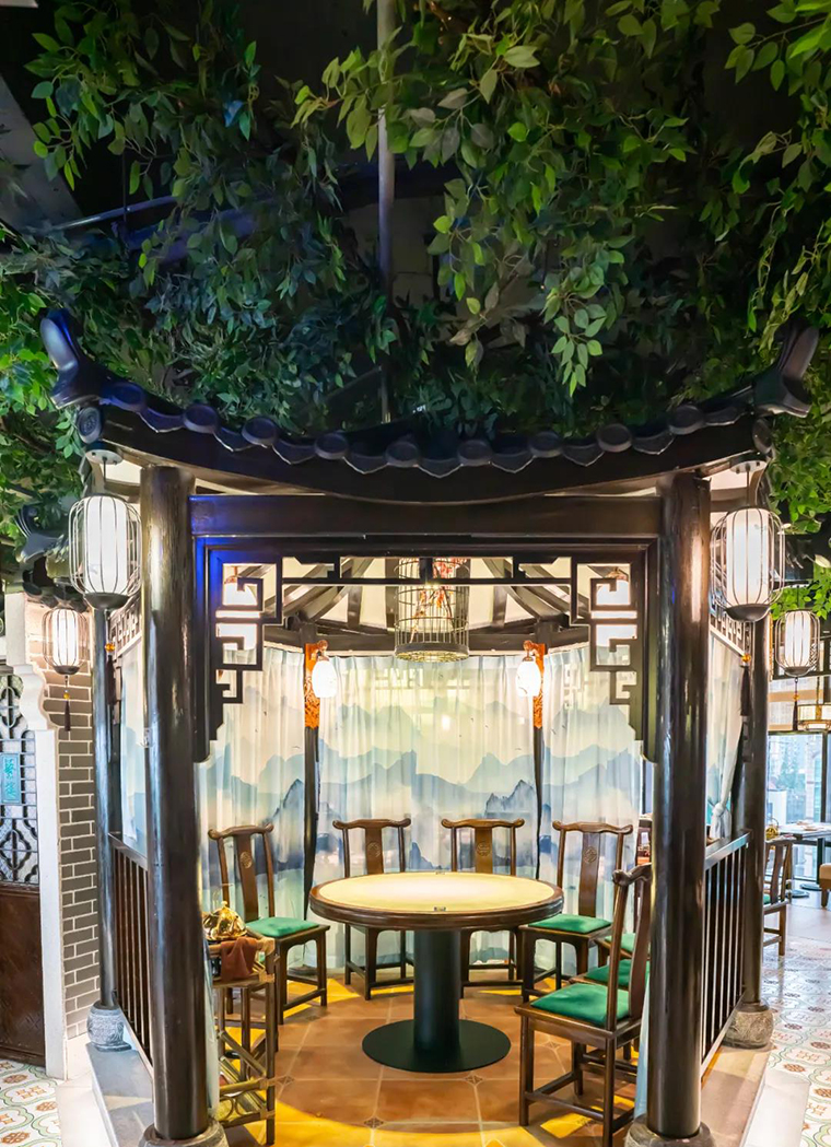 在空間裝飾上,堅(jiān)持將傳統(tǒng)嶺南建筑常用的鑊耳山墻、滿洲窗、廣州老建筑的趟門,具有鮮明地域特色的西關(guān)大屋,廣府人最熟悉的雞公欖,在空間中靈活使用,達(dá)到了一種步移景異,一步一景的空間效果。